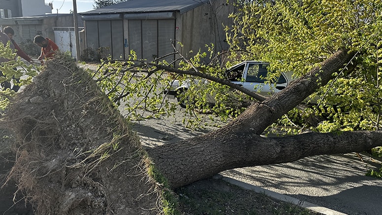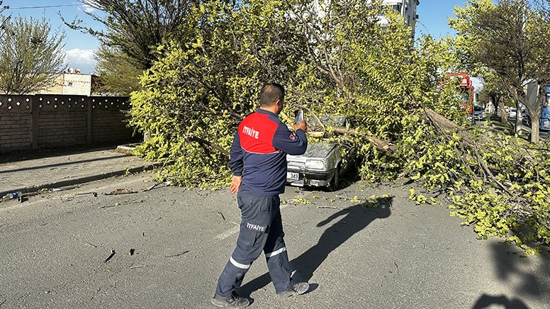 Rüzgarın etkili olduğu kentte, sürücüsünün ismi öğrenilemeyen 76 AN 349 plakalı otomobil İlham Aliyev Caddesi’nde seyir halindeyken üzerine refüjdeki ağaç devrildi.
